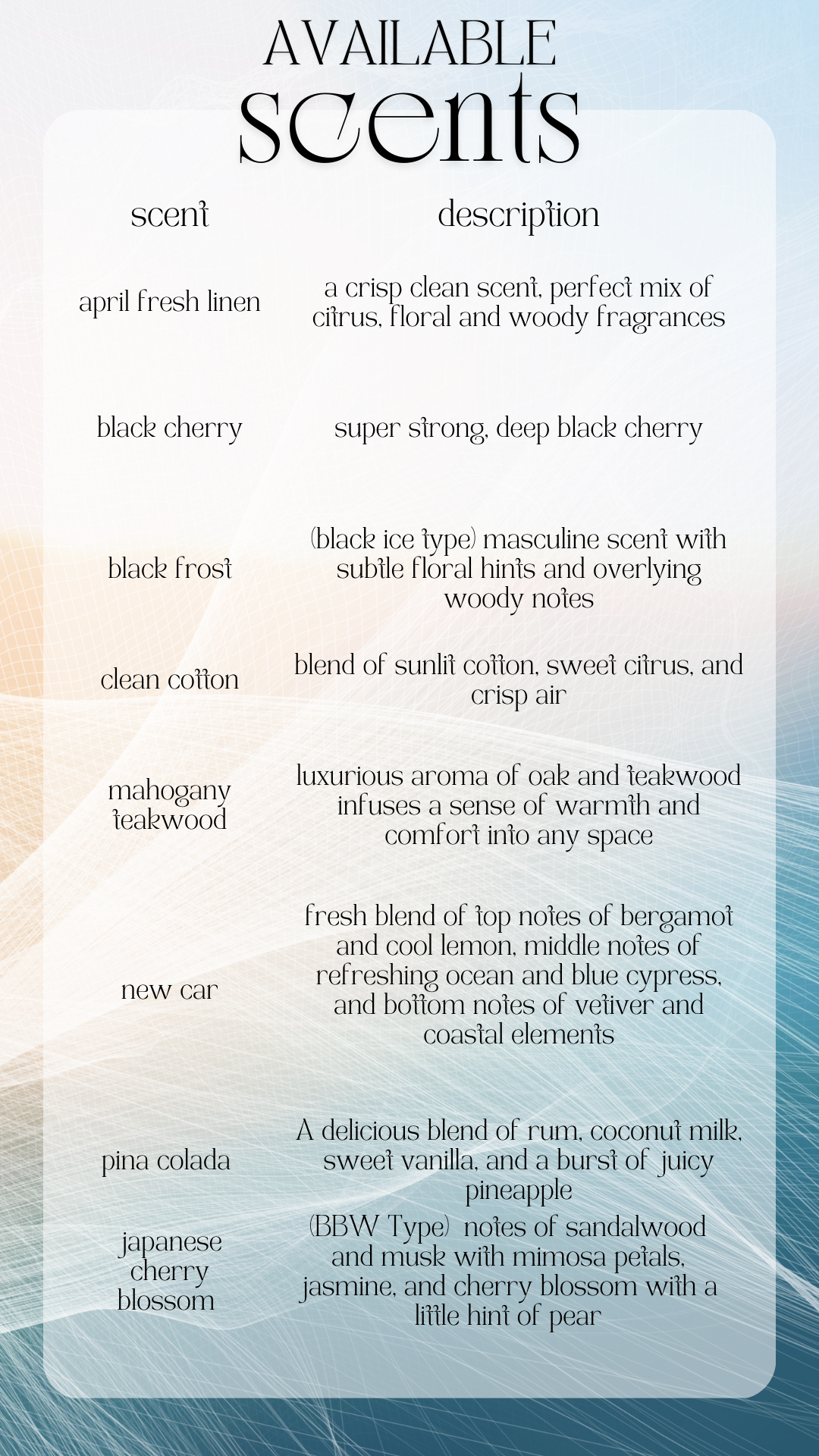These are also reusable!! once the scent fades use your favorite perfume or essential oil to rescent!